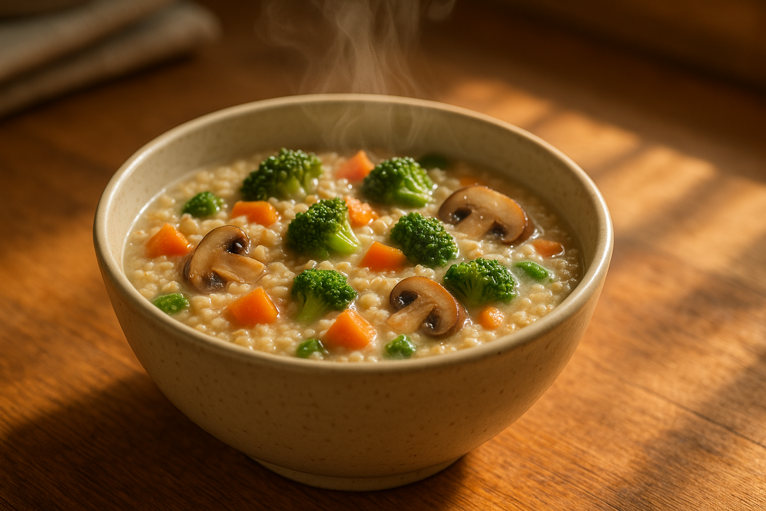 - 재료: 귀리 1/2컵, 당근, 브로콜리, 버섯, 소금 약간