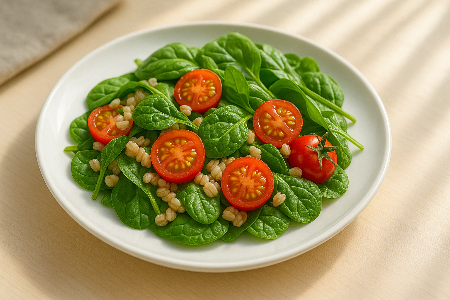 - 재료: 삶은 귀리 1컵, 시금치, 방울토마토, 올리브유, 레몬즙